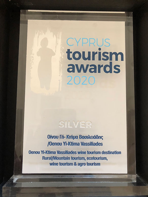 Το οινοποιείο «Οίνου Γη-Κτήμα Βασιλειάδης» με υπερηφάνεια ανακοινώνει την κατάκτηση του Αργυρού μεταλλίου των Cyprus Tourism Awards 2020 στην κατηγορία Travel Offering στο πεδίο του Αγροτικού/Ορεινού Τουρισμού, Οικοτουρισμού, Οινοτουρισμού και Αγροτουρισμού.